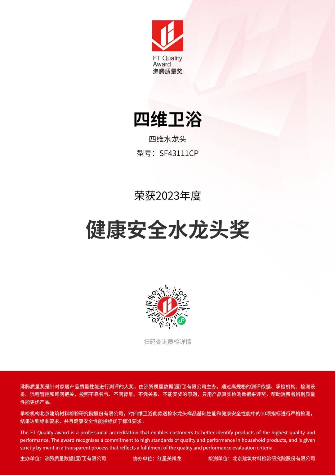 四維衛(wèi)浴參評(píng)的五金龍頭SF43111CP,經(jīng)過承檢機(jī)構(gòu)北京建筑材料檢驗(yàn)研究院股份有限公司,對(duì)四維衛(wèi)浴此款送檢水龍頭樣品基礎(chǔ)性能和健康安全性能中的10項(xiàng)指標(biāo)進(jìn)行嚴(yán)格檢測(cè),結(jié)果達(dá)到標(biāo)準(zhǔn)要求,并且健康安全性能指標(biāo)優(yōu)于標(biāo)準(zhǔn)要求,獲得“健康安全水龍頭獎(jiǎng)”。