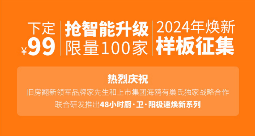 中國(guó)舊房翻新領(lǐng)軍品牌-家先生和上市集團(tuán)海鷗住工-有巢氏獨(dú)家戰(zhàn)略合作聯(lián)合研發(fā)推出48小時(shí)廚衛(wèi)陽極速煥新系列。2024年煥新樣板征集,下定¥99搶智能升級(jí)(限量100家)!