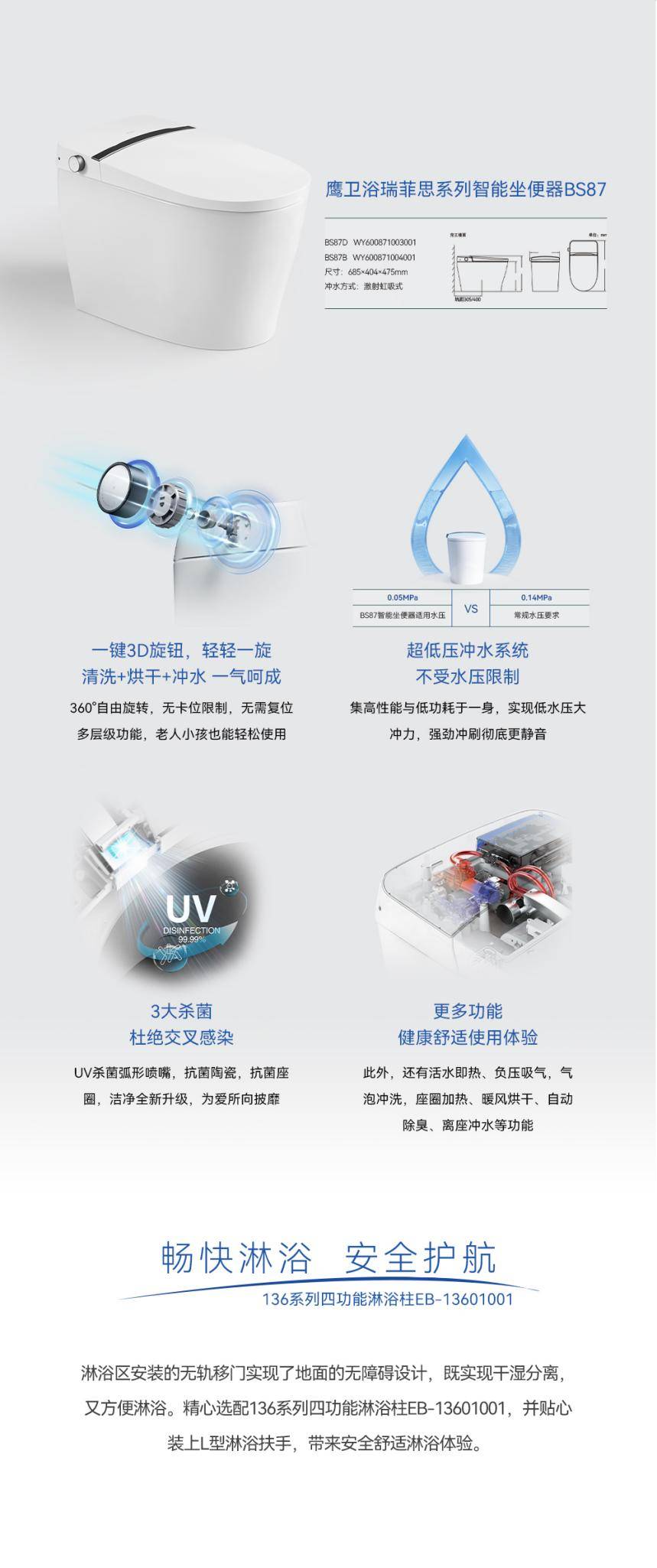 智能化衛(wèi)浴在適老化改造中起到越來(lái)越重要的作用。比起傳統(tǒng)馬桶,智能坐便器,擁有座圈加熱、健康水洗、暖風(fēng)干燥、除菌抗菌等,更適用于老年人的使用。鷹衛(wèi)浴瑞菲思系列智能坐便器BS87,擁有人性化的設(shè)計(jì),全面的智能功能,健康水洗體驗(yàn),便捷的遙控操作,讓“養(yǎng)老”變“享老”。