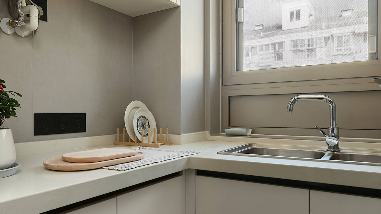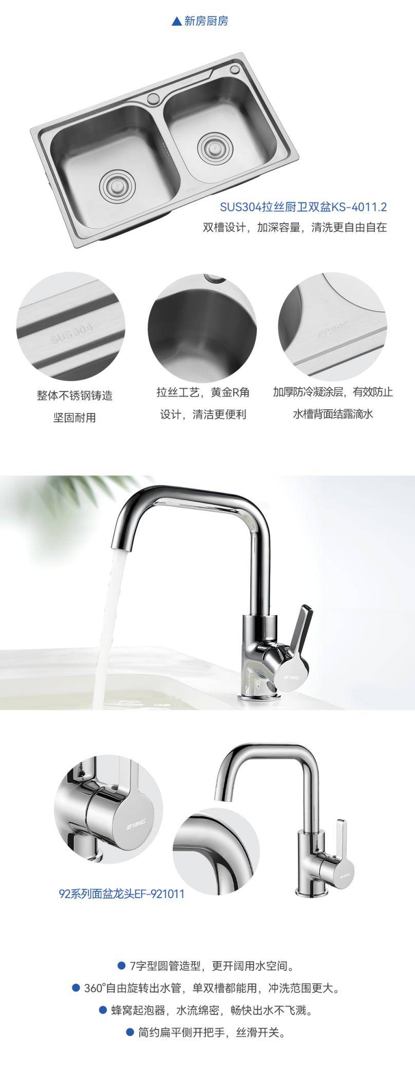 新房廚房寬敞明亮,設(shè)備齊全,搭配鷹衛(wèi)浴SUS304拉絲廚衛(wèi)雙盆KS-4011.2和92系列面盆龍頭EF-921011,暢享廚房樂(lè)趣。