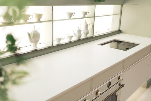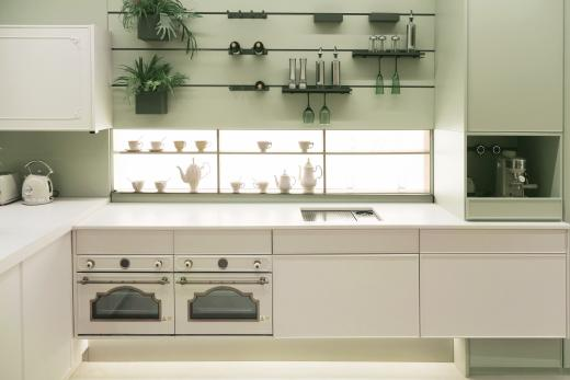 朦朧的陽光,生機盎然的綠植,法薩臺面石以奶油色為基調(diào),一抹綠色抵達視覺深處,治愈又自得,充滿趣味性的變化帶來彌新的感觸,穿著家居服、挽著發(fā)絲的在廚房忙碌的優(yōu)雅女士,仿佛空間自帶浪漫的法式電影感濾鏡。