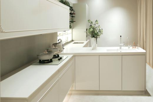 一抹奶油色調(diào)的溫柔鋪陳,選取石英石國色系列為廚房場域增添淡雅和煦的氛圍,帶來藝術(shù)美感,在天氣明媚的日子,陽光便能穿過窗框在廚房落腳,增加烹飪的舒心感與用餐的愉悅感。