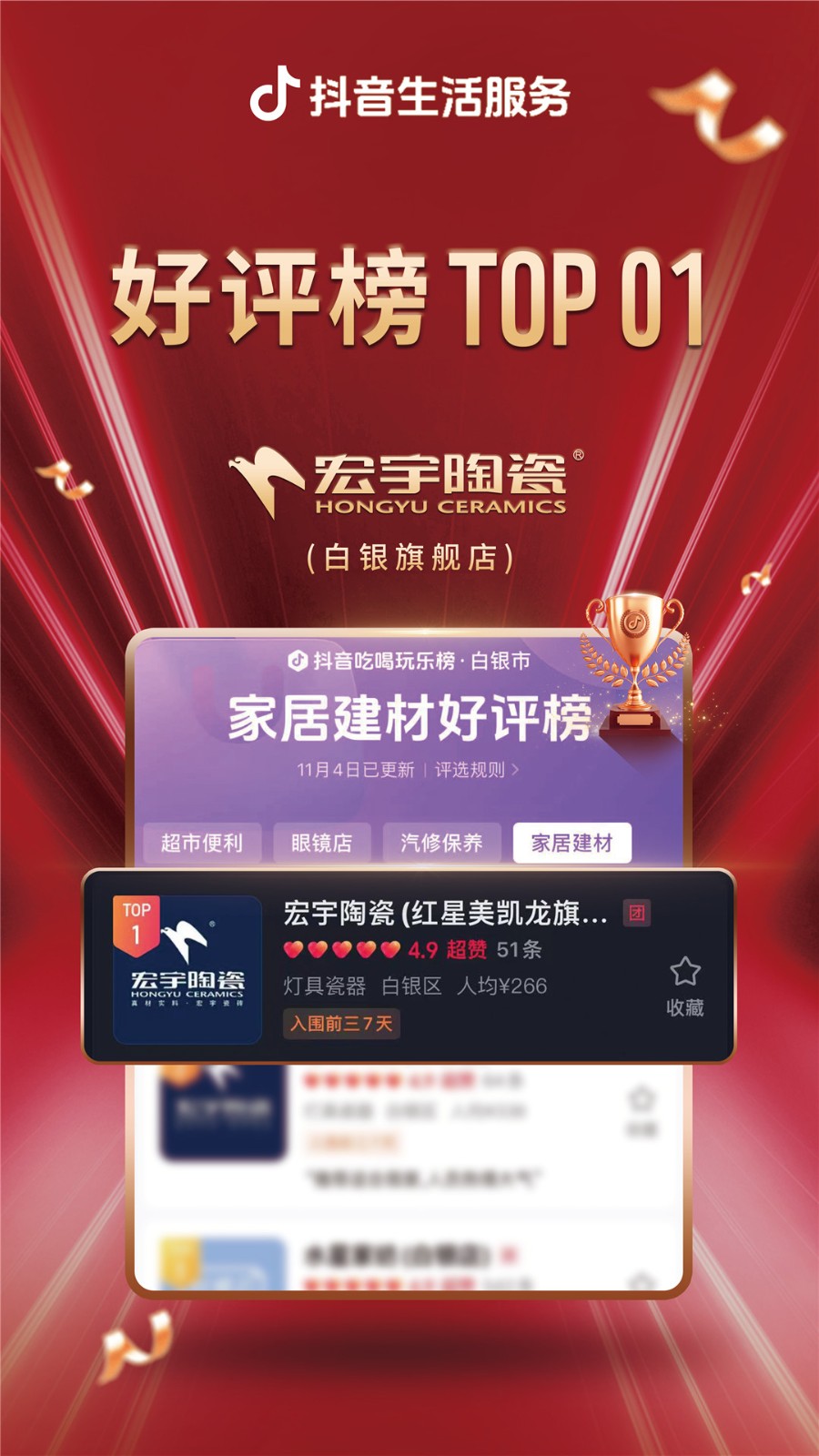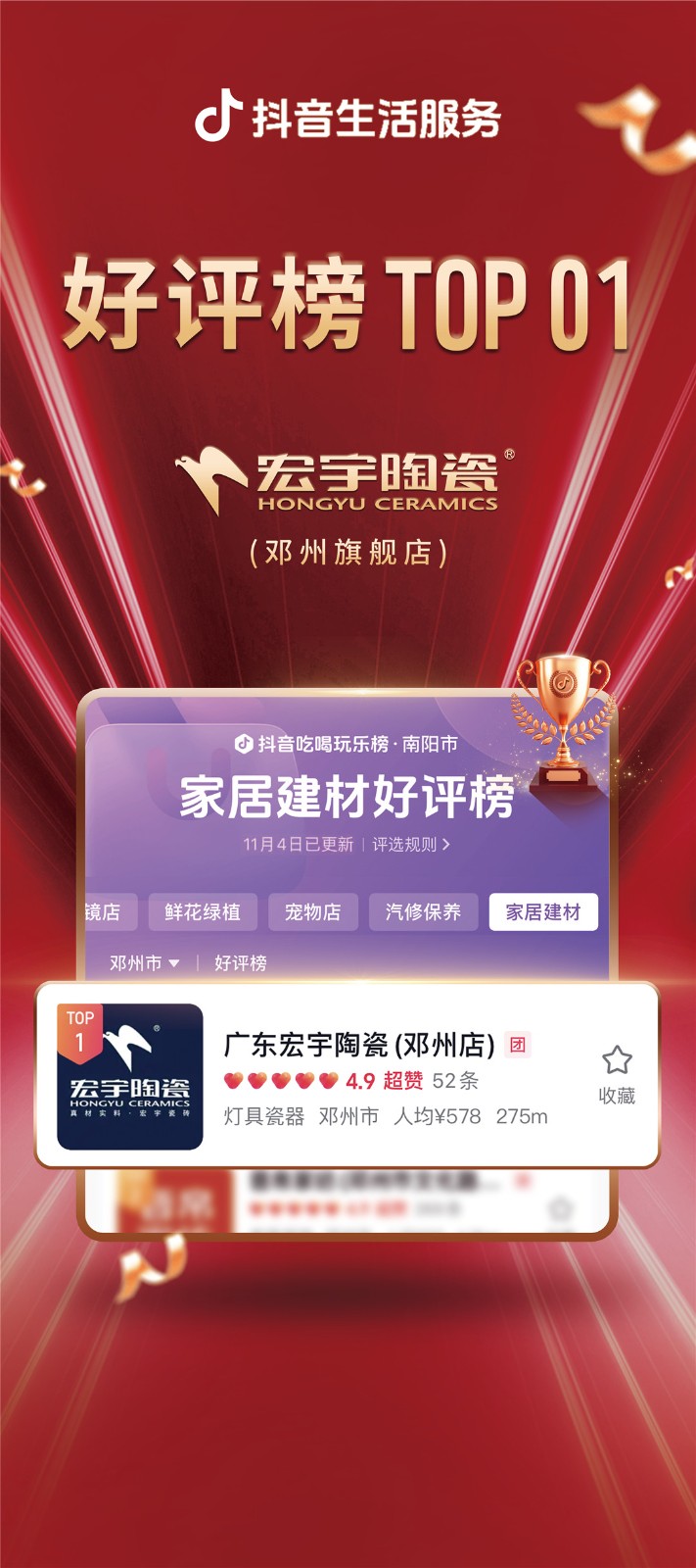 宏宇陶瓷“千城霸榜行動(dòng)計(jì)劃”強(qiáng)勢來襲,席卷全國。雙11狂歡購活動(dòng)期間,宏宇陶瓷全國多地門店在激烈的市場競爭中持續(xù)保持強(qiáng)勁勢頭,一舉奪魁,榮登抖音同城家居建材好評榜榜首,成為眾多消費(fèi)者信賴的首選品牌。